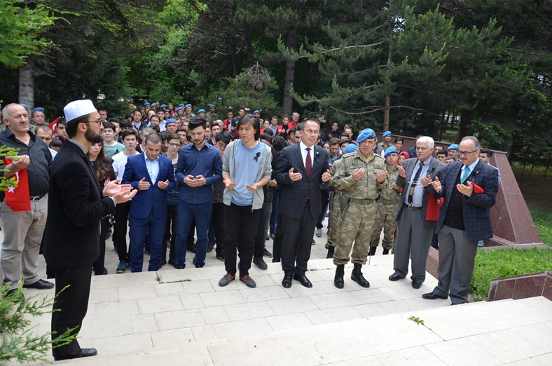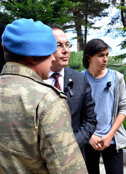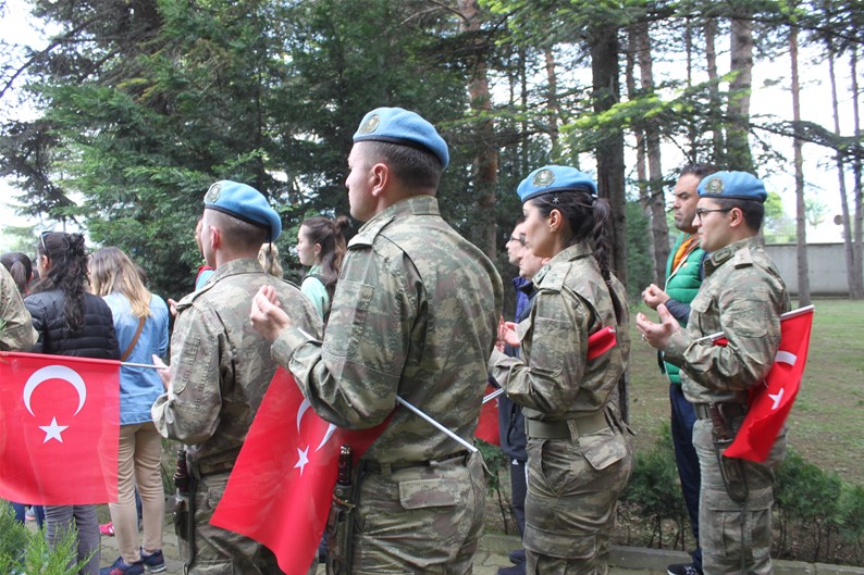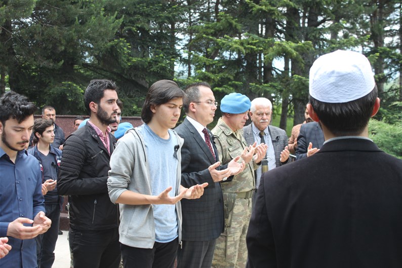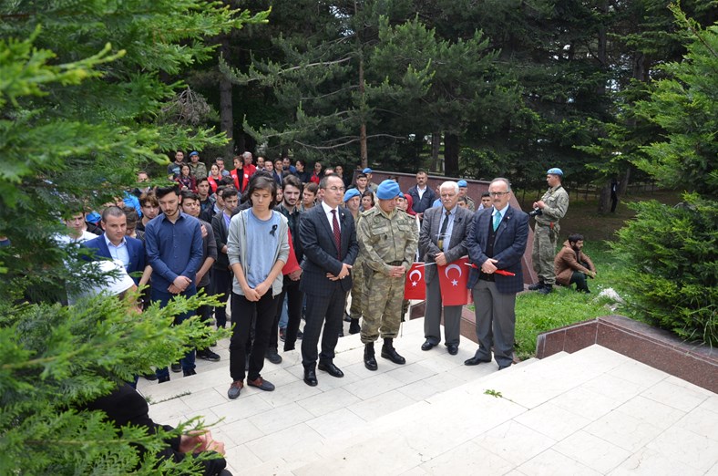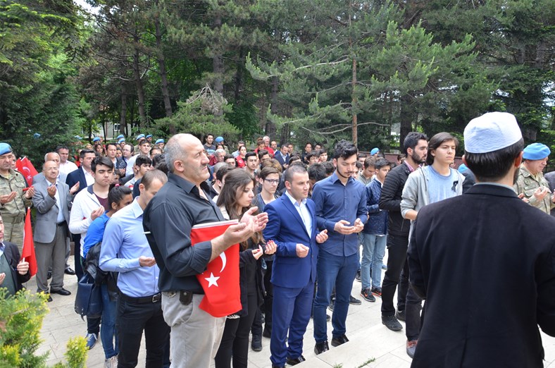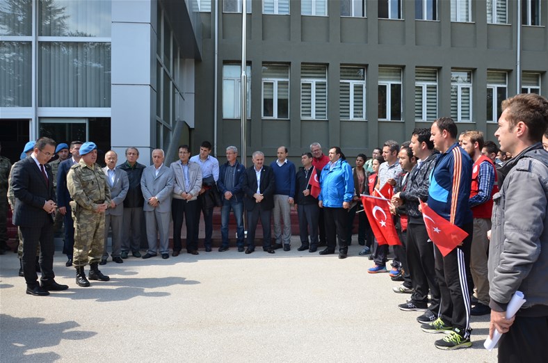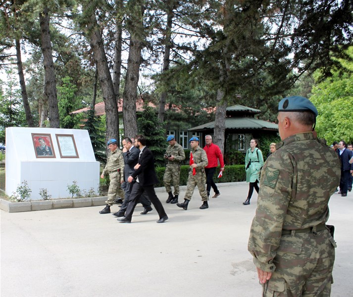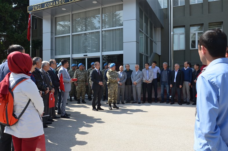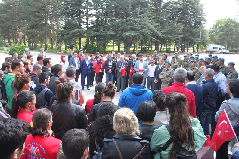 Bolu Gençlik Hizmetleri ve Spor İl müdürlüğümüz tarafından organize edilerek, şehit düşen aziz askerlerimizin anısına Bolu 2. Komando Tugayı’na kurumumuz şube müdürleri, personelimiz ve ilimizdeki okullardan kurum müdürleri ve öğrencileri ile birlikte sayın Kurmay Albay Muammer Alper’i ziyaret gerçekleştirildi. İl müdürümüz sayın Şahin Ertem personelimiz ve tüm gençlerimiz adına sayın Kurmay Albay Muammer Alper’e bayrak takdim etti. Sayın Alper, İl Müdürümüz sayın Şahin Ertem’e ;“Zor günümüzde yanımızda oldunuz metanetimiz artırdınız. Geldiğiniz için teşekkür ederim “diye belirtti. Ardından 353 şehiti temsilen kurulan şehitlikte Şehadet mertebesine erişen şehit askerlerimiz için okunan Yasin-i Şerif’ten sonra toplu dua edildi.